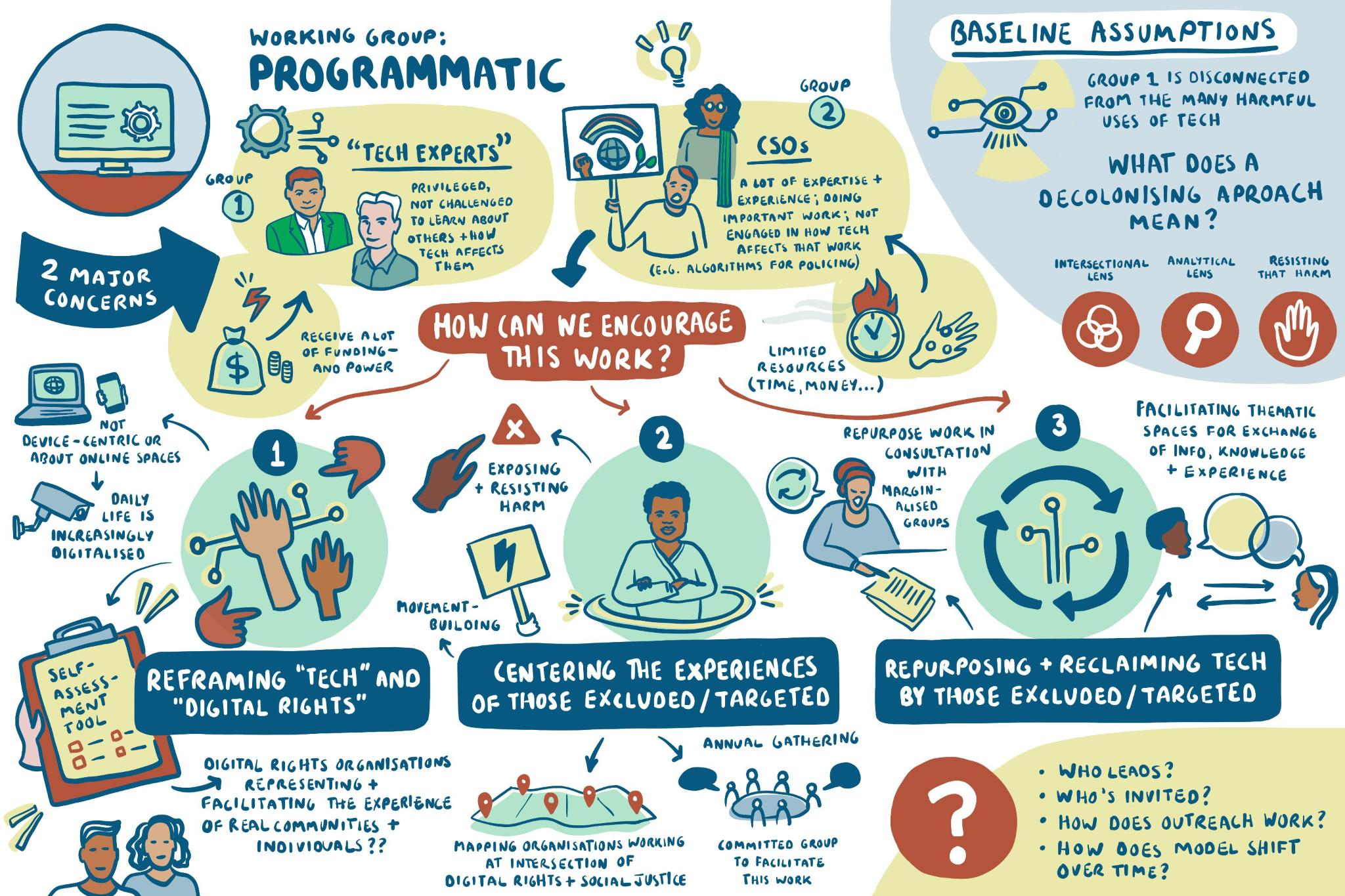 In order to do this, we needed to ‘create a place’ for imagining. The entire decolonising process, rather than simply critiquing how digital rights work in Europe is currently organised, has been about building an alternative space. In order to have the space to imagine, we have first had to focus on building understanding and community between the participants involved, each bringing their own ‘organising baggage’ to the group; their own histories, hopes, ideologies, pain and expectations.